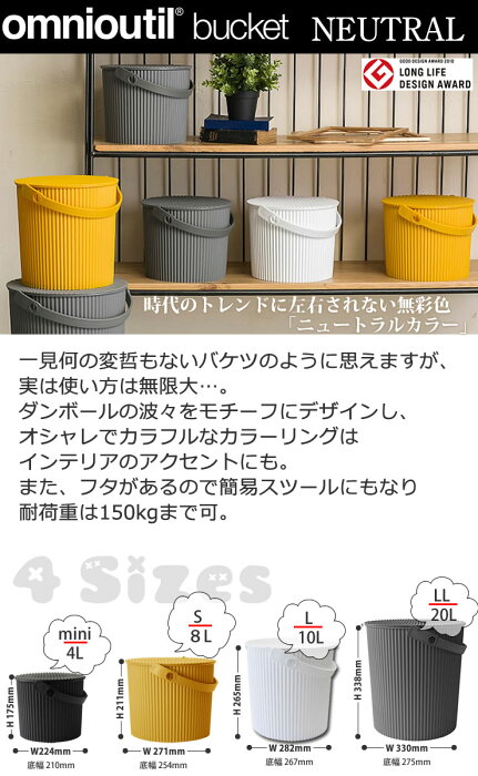 omnioutil neutral L/ オムニウッティ ニュートラル L/八幡化成 仕様 サイズ:約W282×D267×H265mm(D・Hサイズはハンドルを含まず) 材質:本体・フタ・ハンドル/ポリプロピレン、リング/ポリエチレン 重量:約825g 容量:10L 耐荷重:約150kg試験済み(但し、フタ全体荷重) 耐熱温度:120℃ 原産国:日本 ※フタとハンドル、本体とリング(ホース穴)が同色の組み合わせとなります。