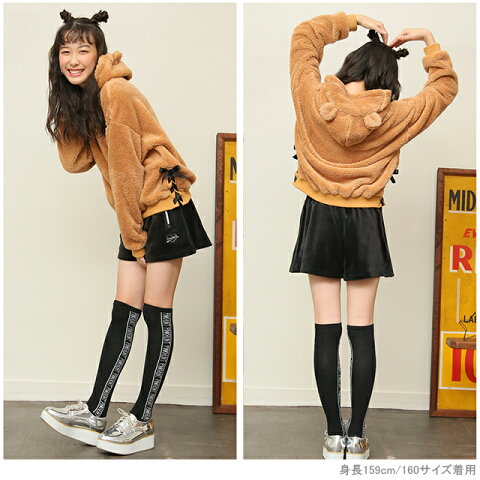 本体:ポリエステル97%/ポリウレタン3% 別布部分:ポリエステル100% ベロア素材 刺繍 サイドファスナーポケット×2 ウエストバックゴム入り/ボタン調整可 一体型インナーパンツ付き ※写真のプリント位置と多少の誤差が生じる場合があります。